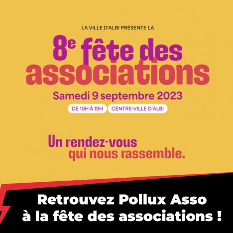 Fête des associations Samedi 9 Septembre - 10H-19H Jardin National - Albi Retrouvez le Stand Pollux à la 8e édition de la Fête des associations organisée par la Ville d'Albi ce samedi 9 septembre 2023. Fédérer les associations, les faire connaître du public, mettre en valeur le dynamisme et l'engagement du monde associatif albigeois et… -